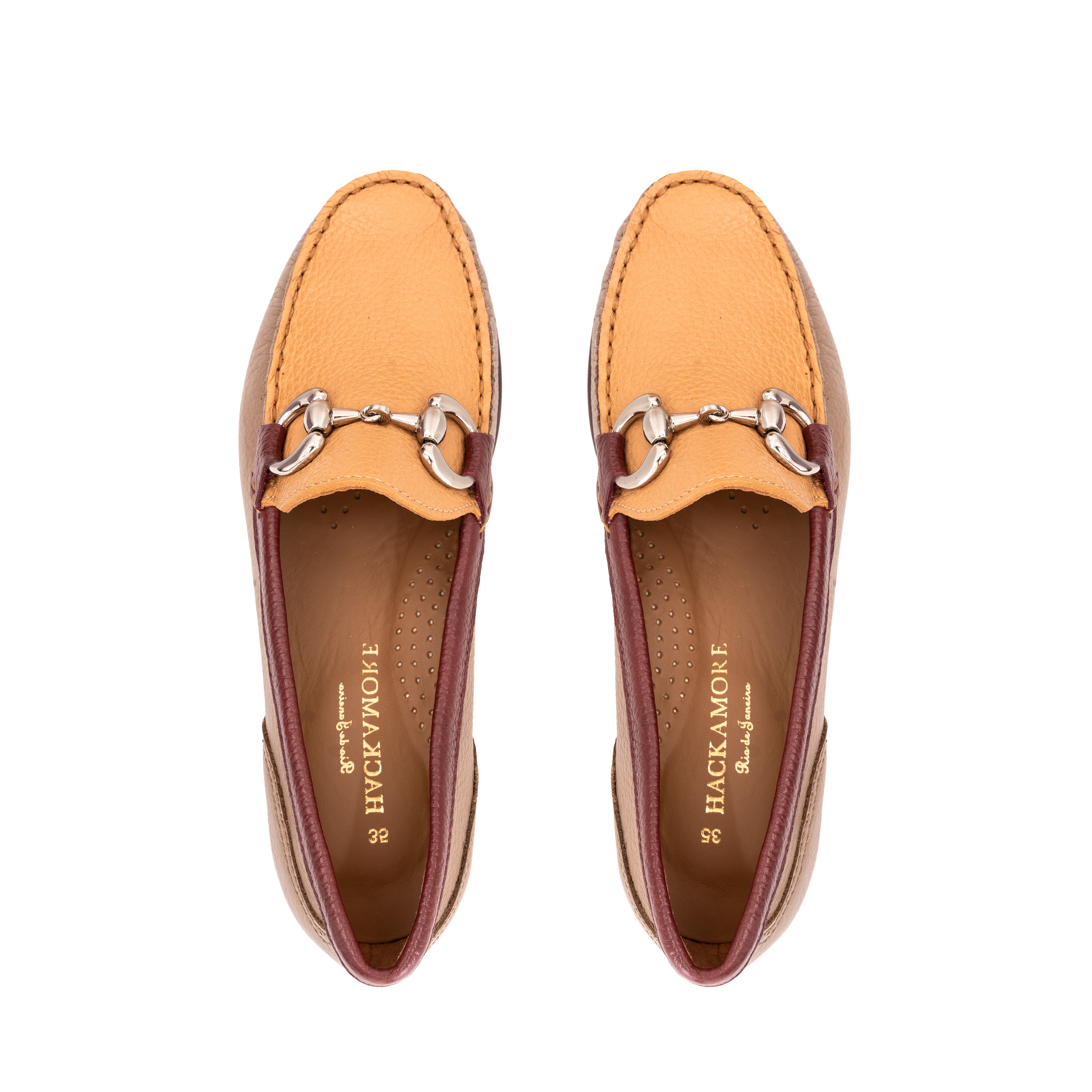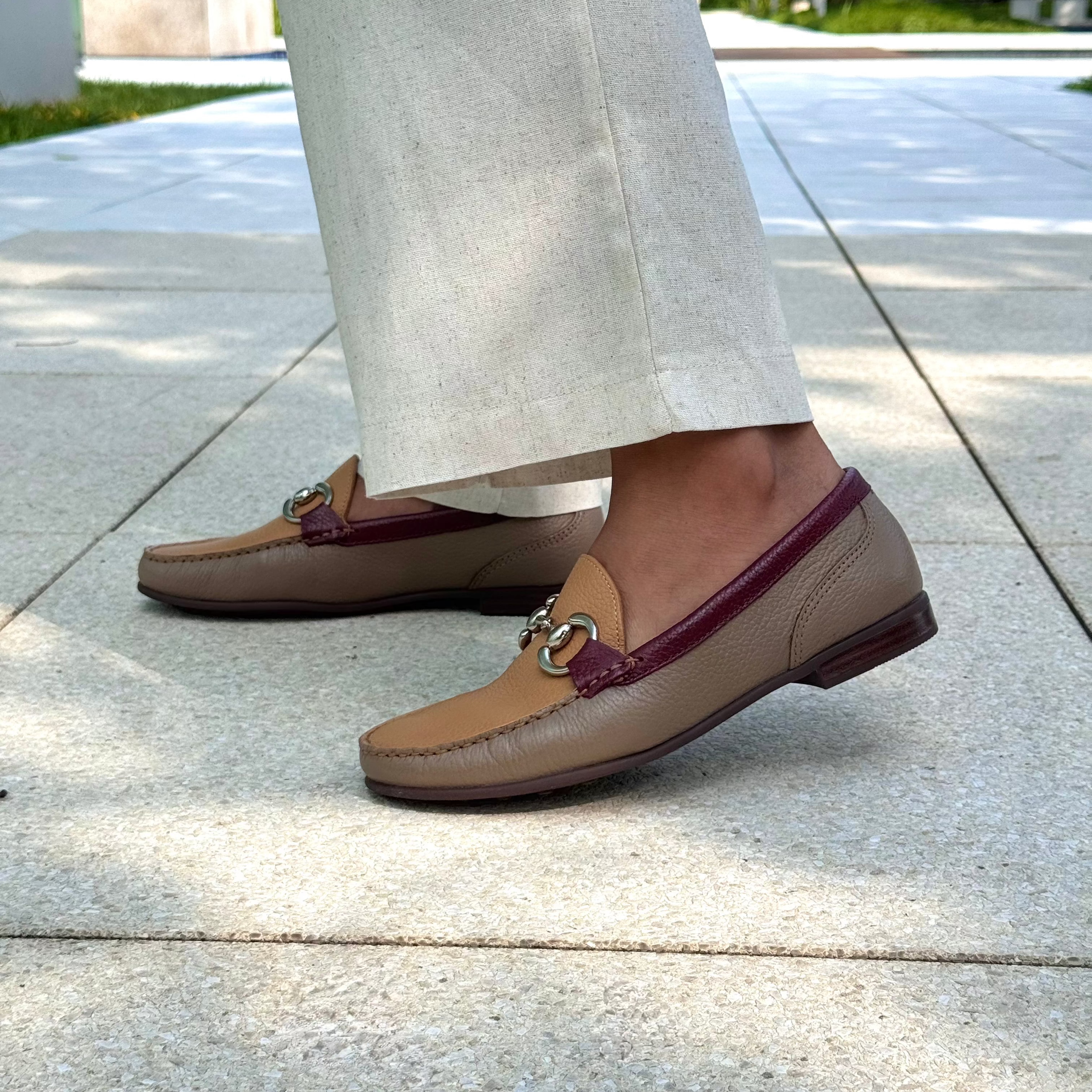 - Mocassim confeccionado em couro floater mesclando os tons mel e taupe utilizando processo artesanal diferenciado