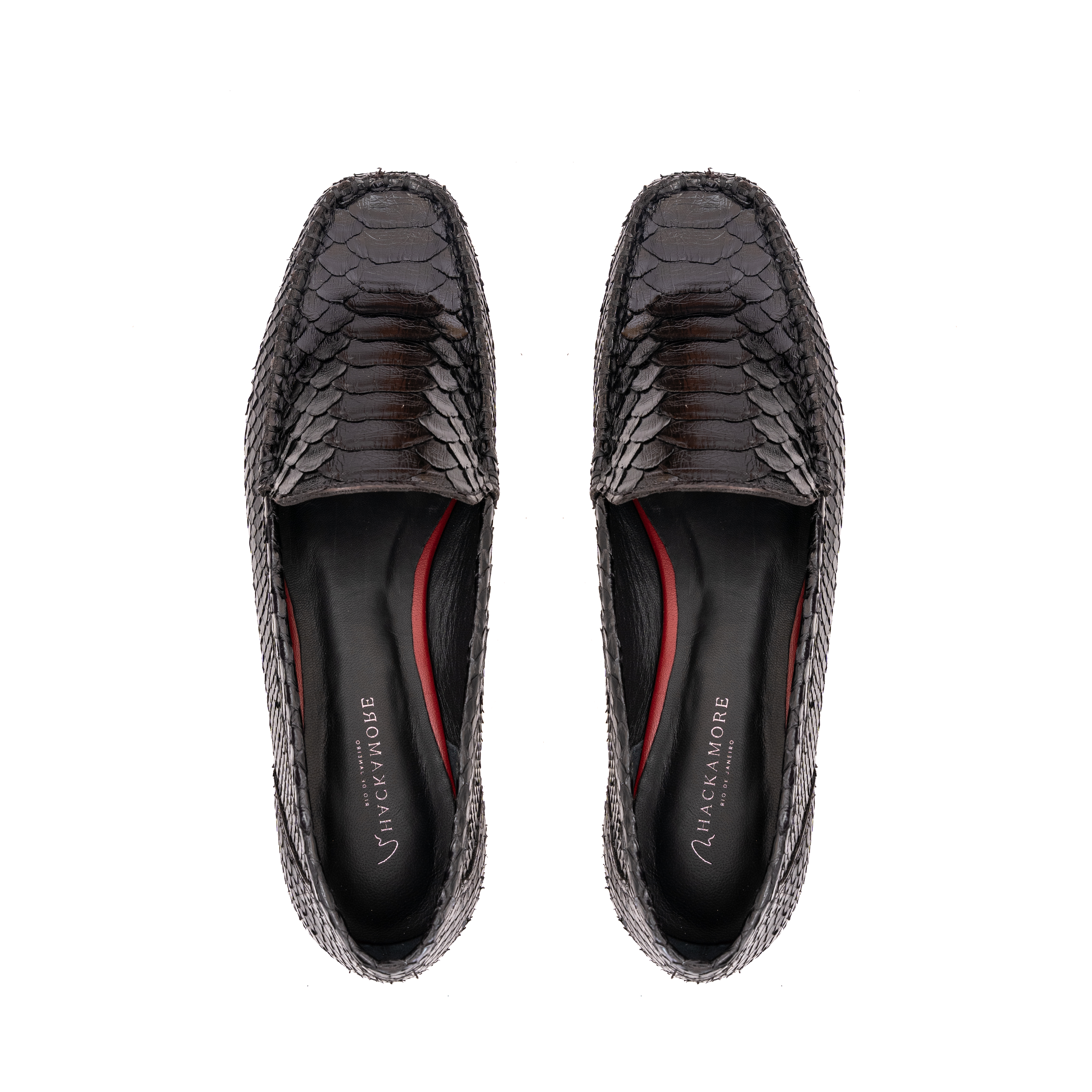 - Mocassim confeccionado em couro exótico python no tom preto, bico quadrado