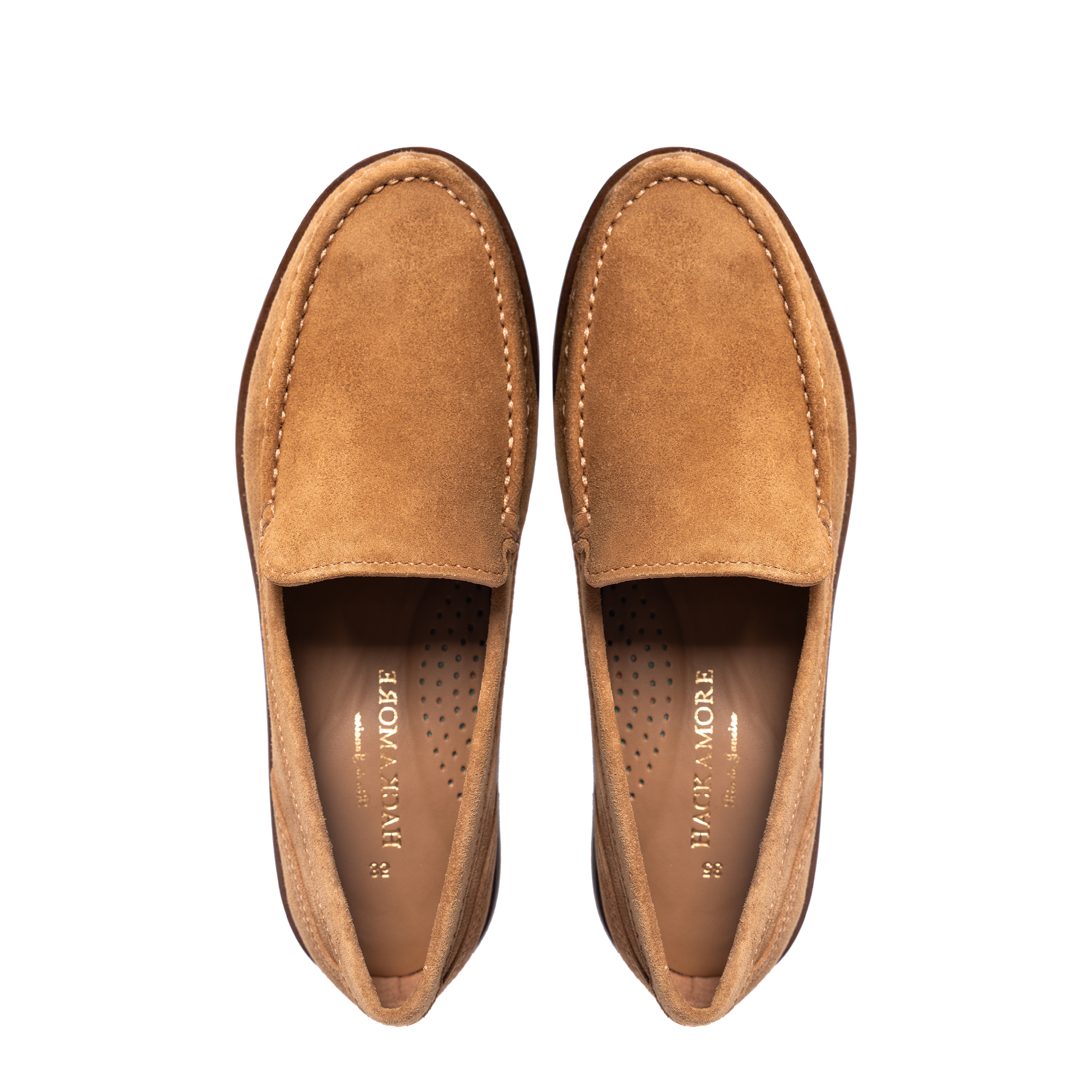 - Mocassim feminino confeccionado em couro camurça no tom tabaco, recebe tratamento para repelir a água deixando a camurça mais resistente