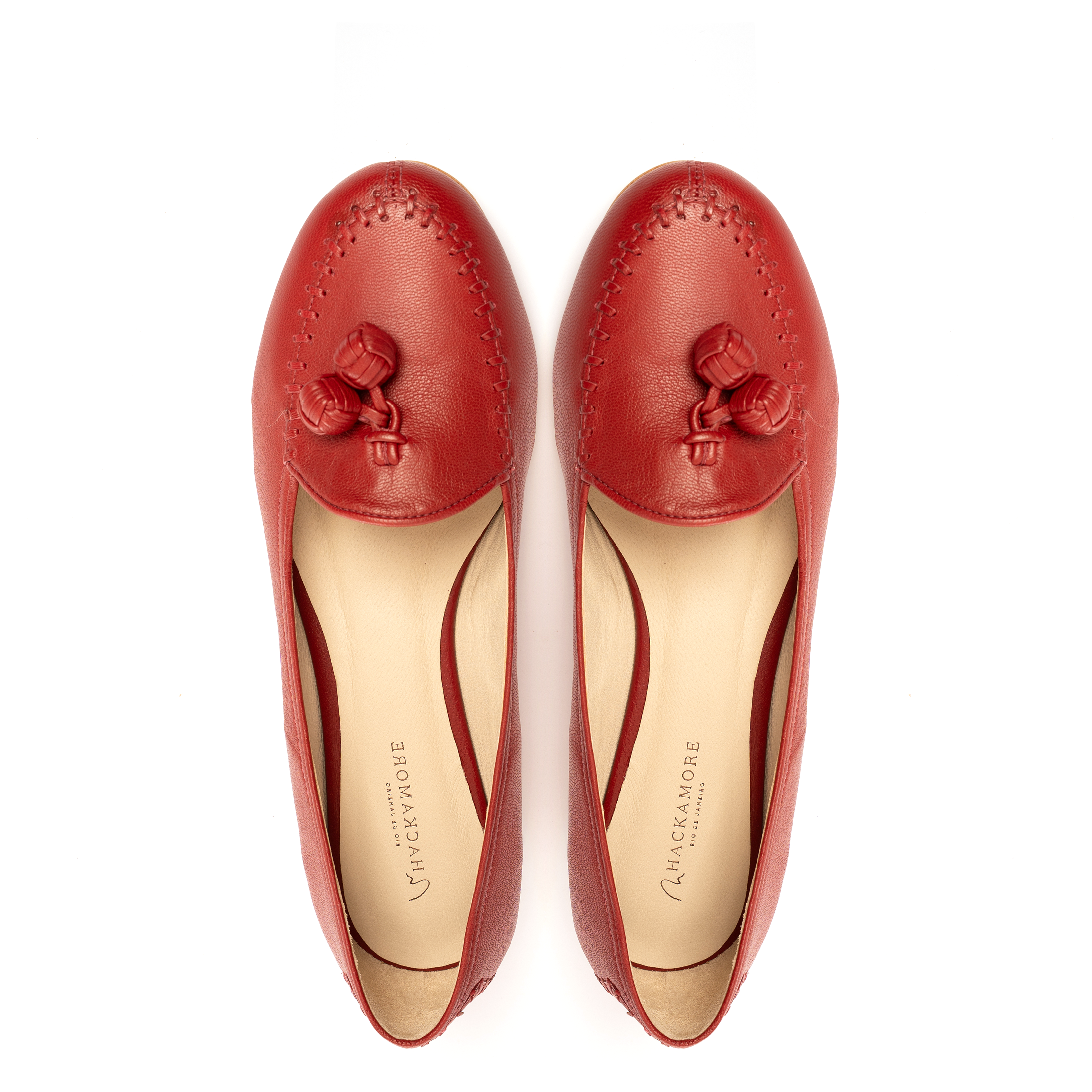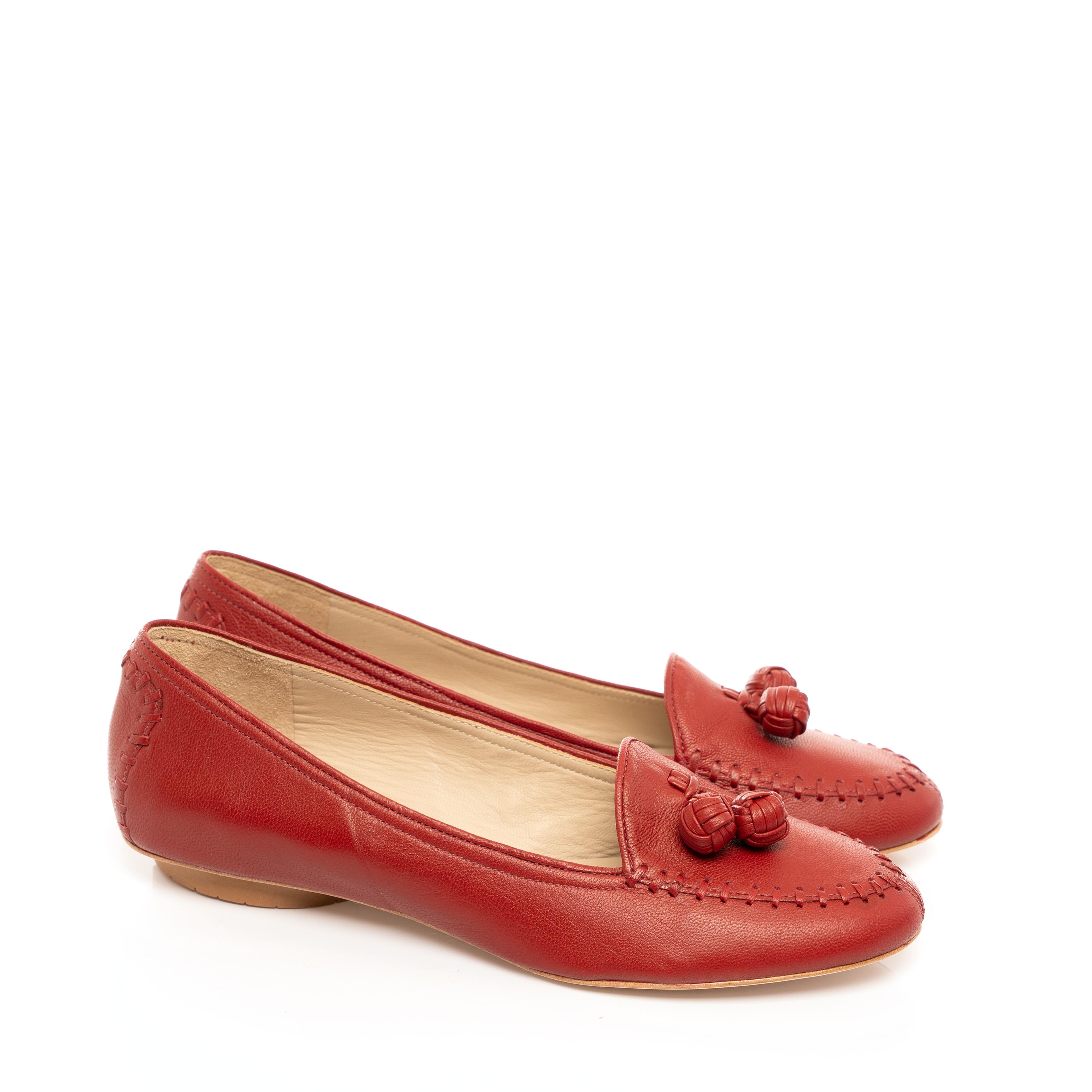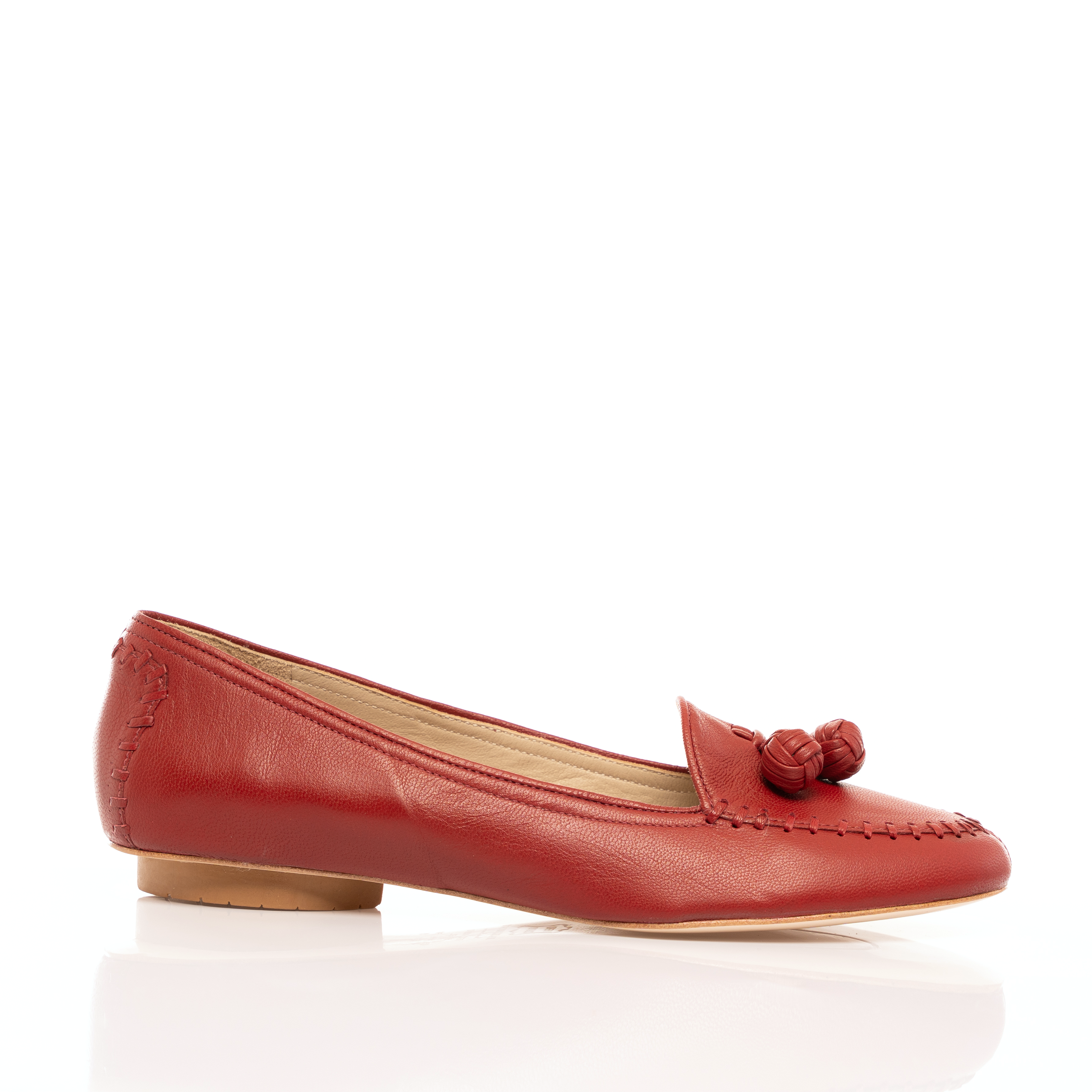 ·        Mocassim confeccionado em couro mestiço no tom cereja e bico amendoado
