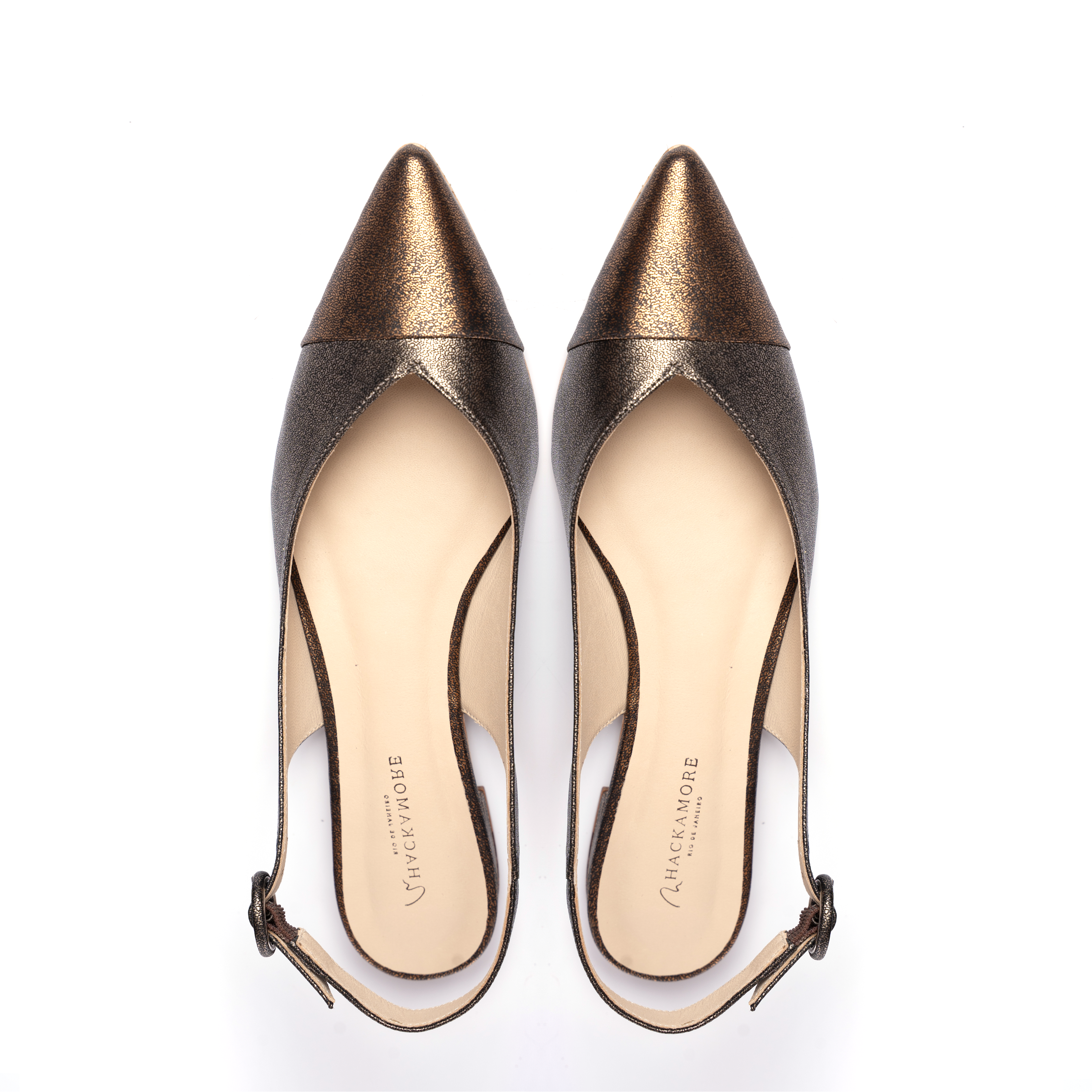 - Sapatilha confeccionada em couro mestiço metalizado mesclando os tons dourado e prata velho, modelo slingback, bico fino