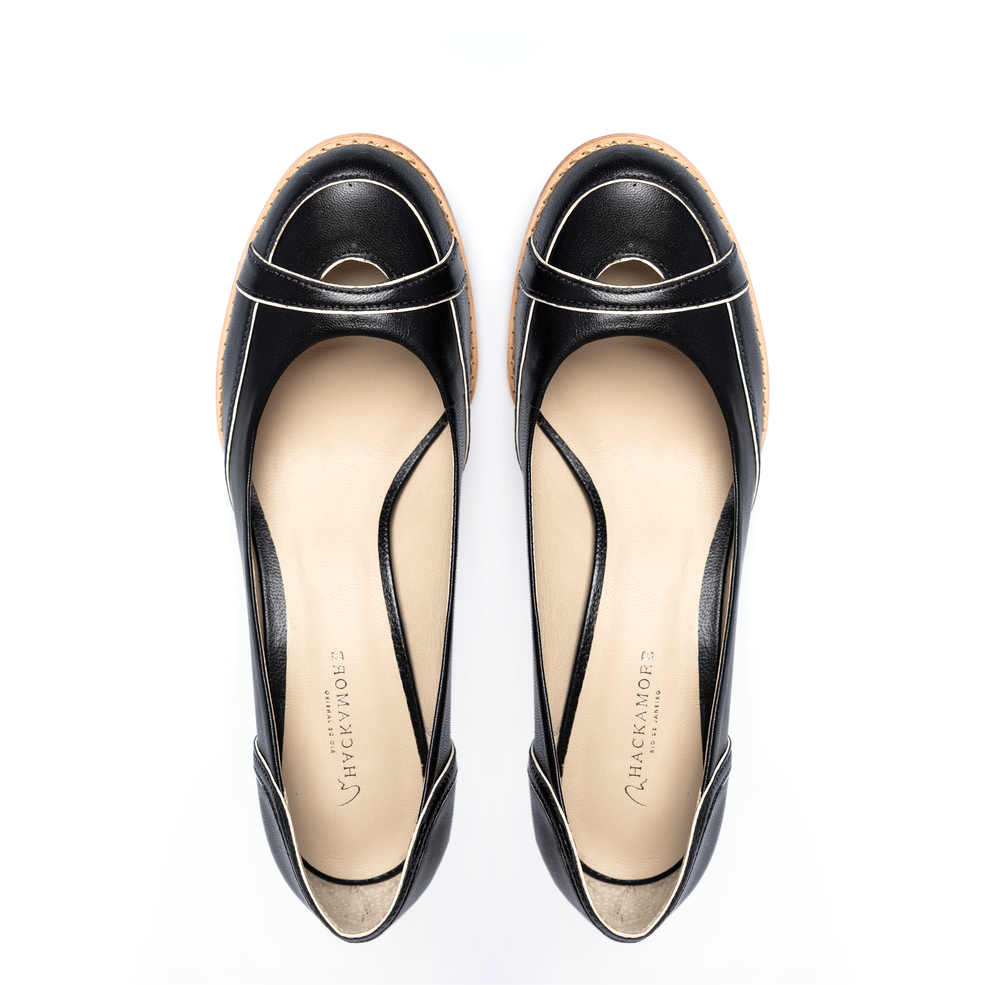 ·        Scarpin feminino confeccionado em couro mestiço no tom preto com detalhe de vivo francês no tom off white, realçando os detalhes do modelo