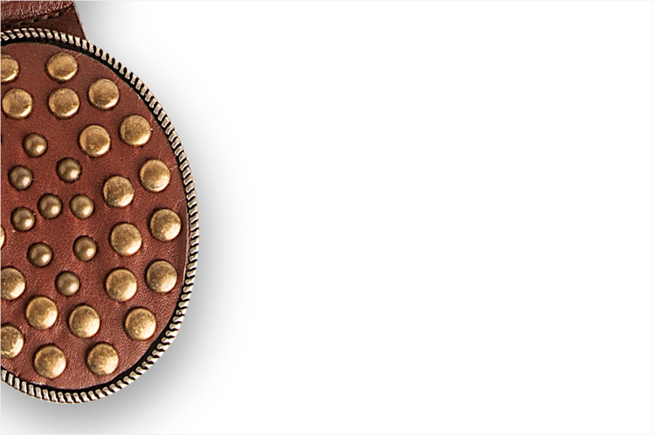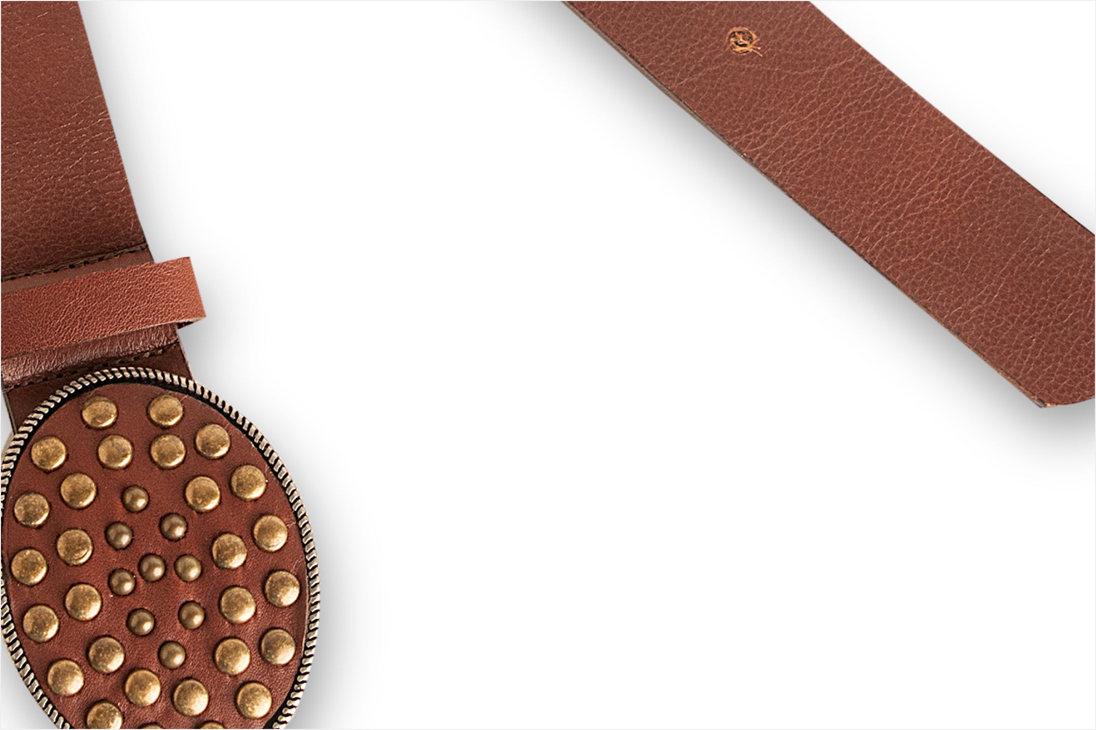 · Fivela em formato oval, no banho ouro velho, forrada em couro no tom havana e trabalhada com tachas de acabamento arredondado