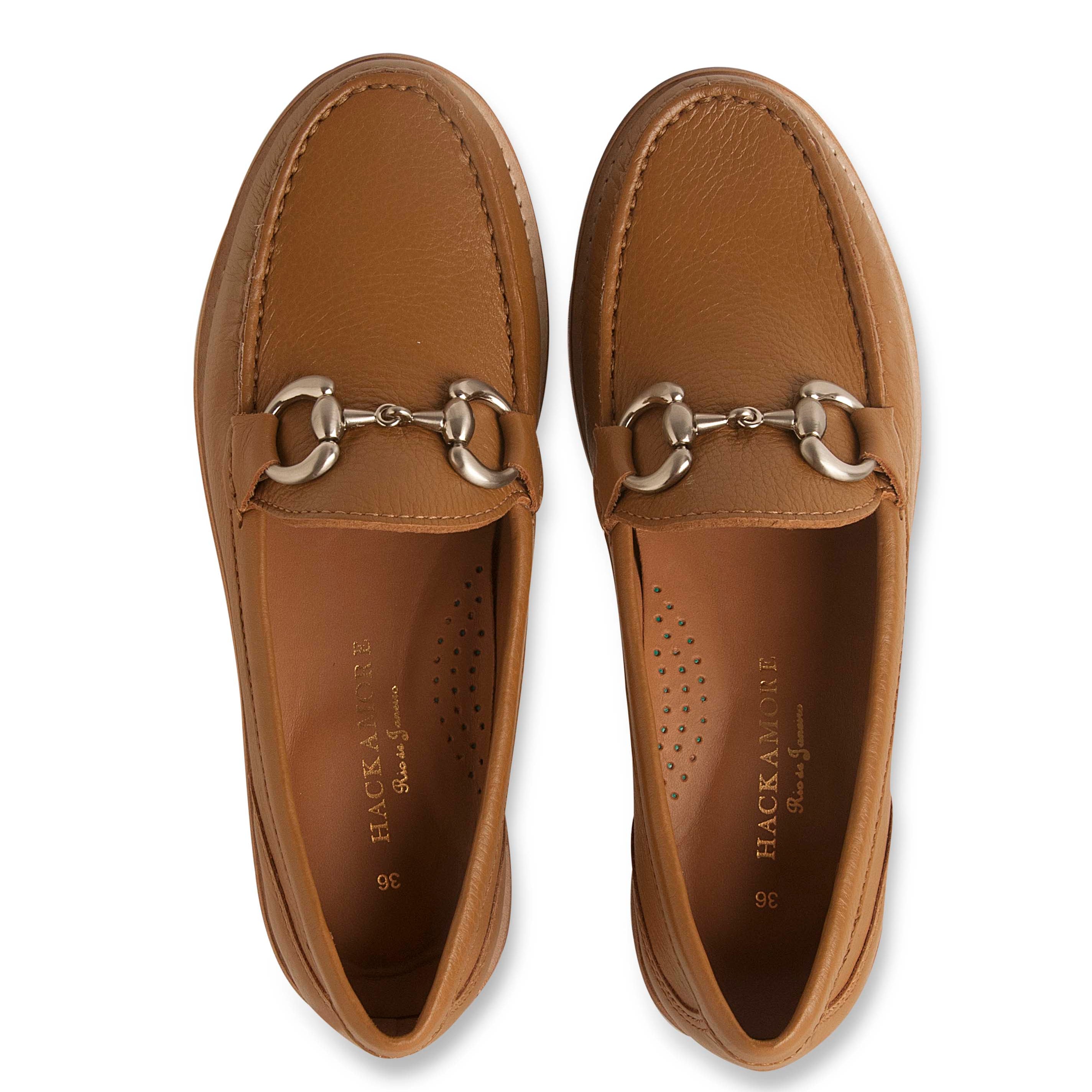 • Mocassim feminino confeccionado em couro floater no tom sela