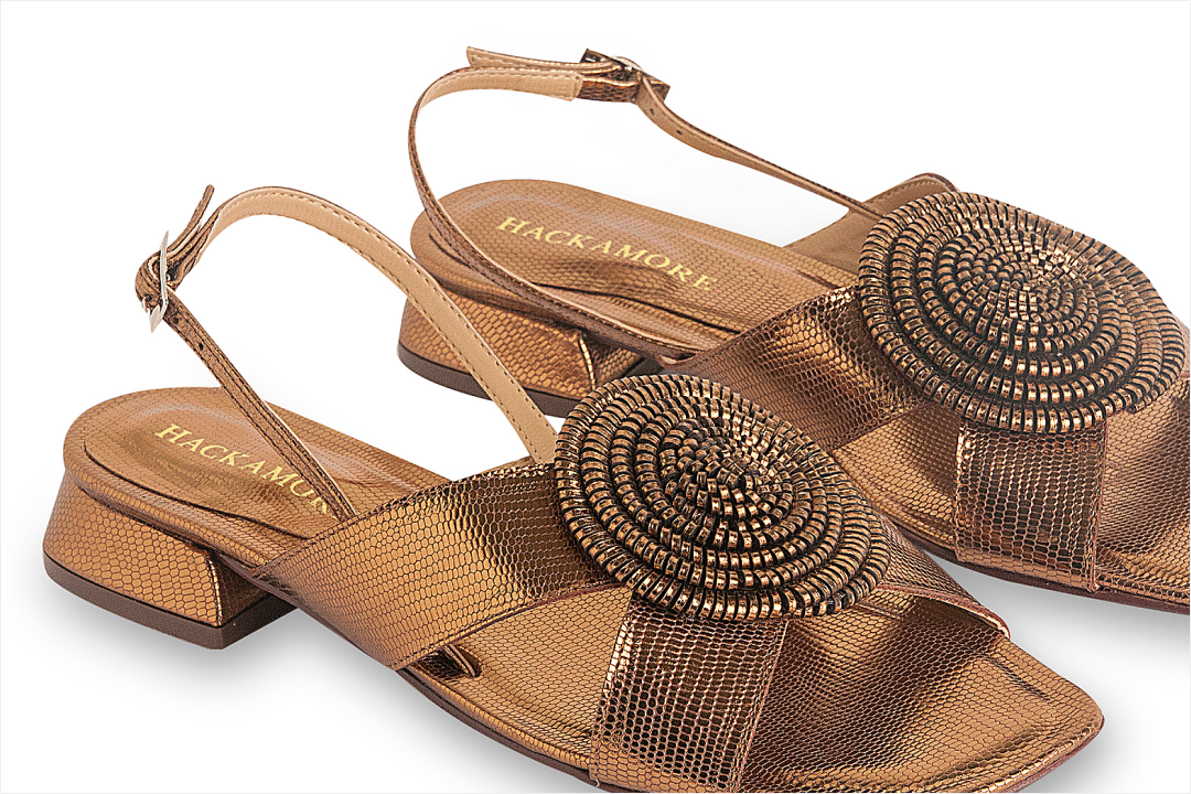 · Palmilha acolchoada forrada em couro metalizado no tom bronze