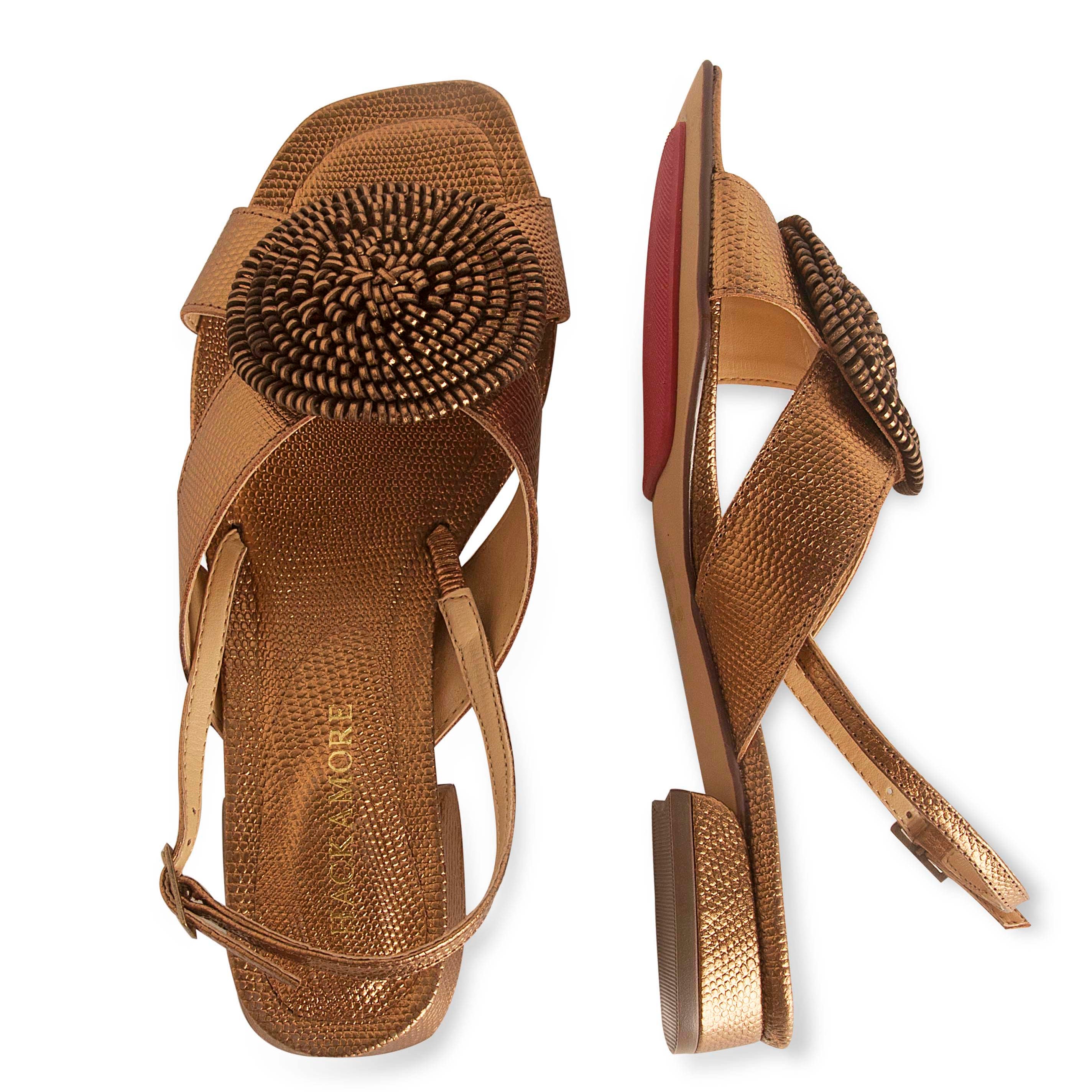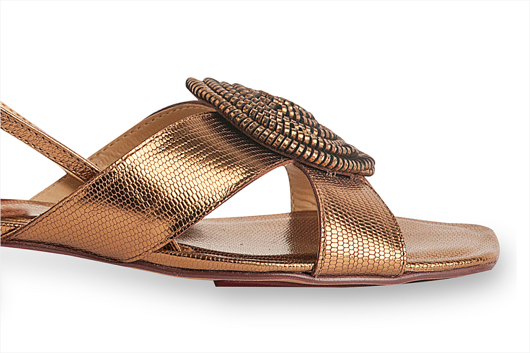 · Sandália rasteira confeccionada em couro bovino metalizado textura lezard no tom bronze e bico quadrado