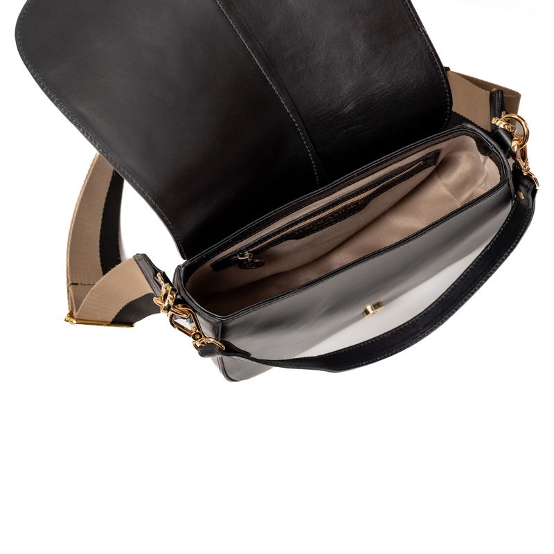 - Bolsa de tamanho médio, confeccionada em couro no tom preto, modelo com tampa, estruturada e acabamento que proporciona leve brilho ao couro