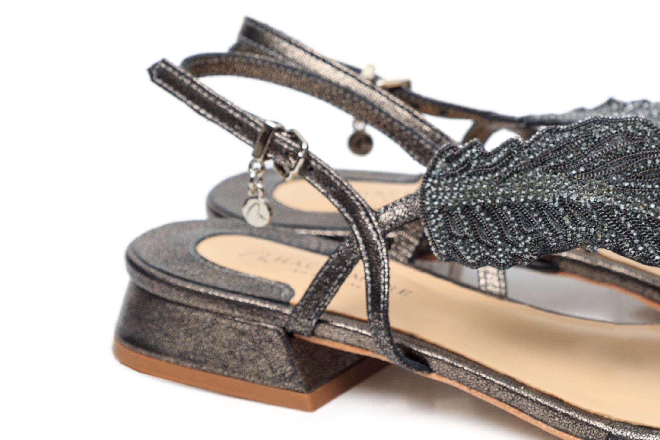 - Sandália rasteira confeccionada em couro mestiço metalizado no tom prata velho de bico levemente quadrado