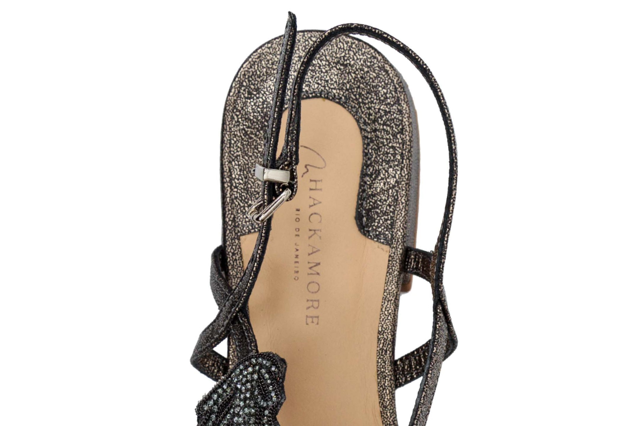 - Cabedal em tiras de couro com detalhe de enfeite em forma de folha, posicionado lateralmente, confeccionado artesanalmente com mini corrente em strass intercalada com mini corrente