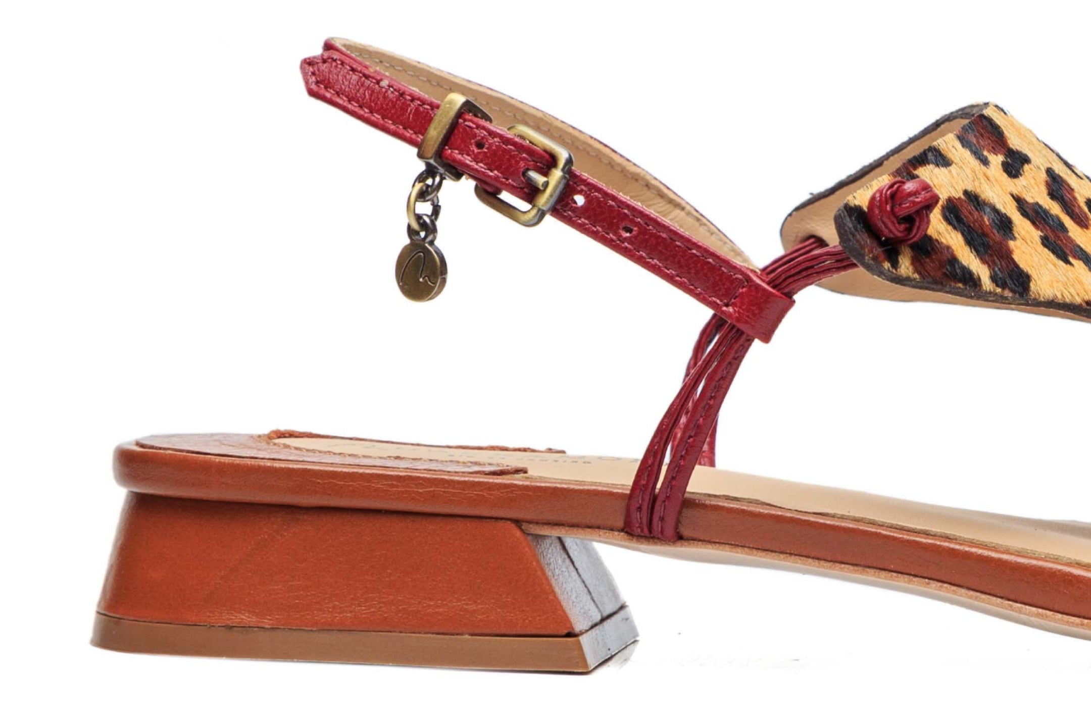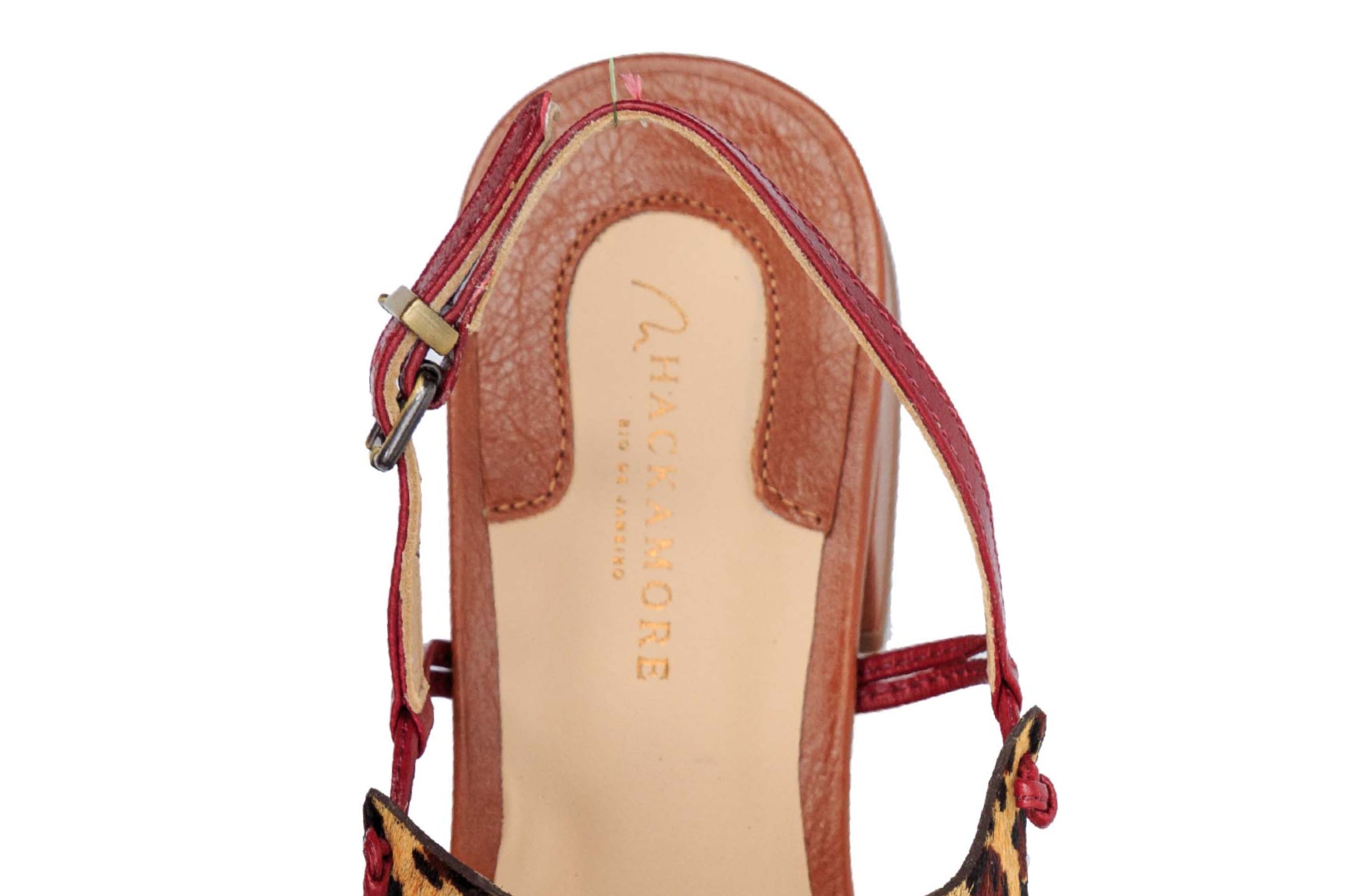 - Gáspea em formato triangular em pelo estampa leopardo presa na frente e nas laterais por tiras com nós em couro no tom rosso