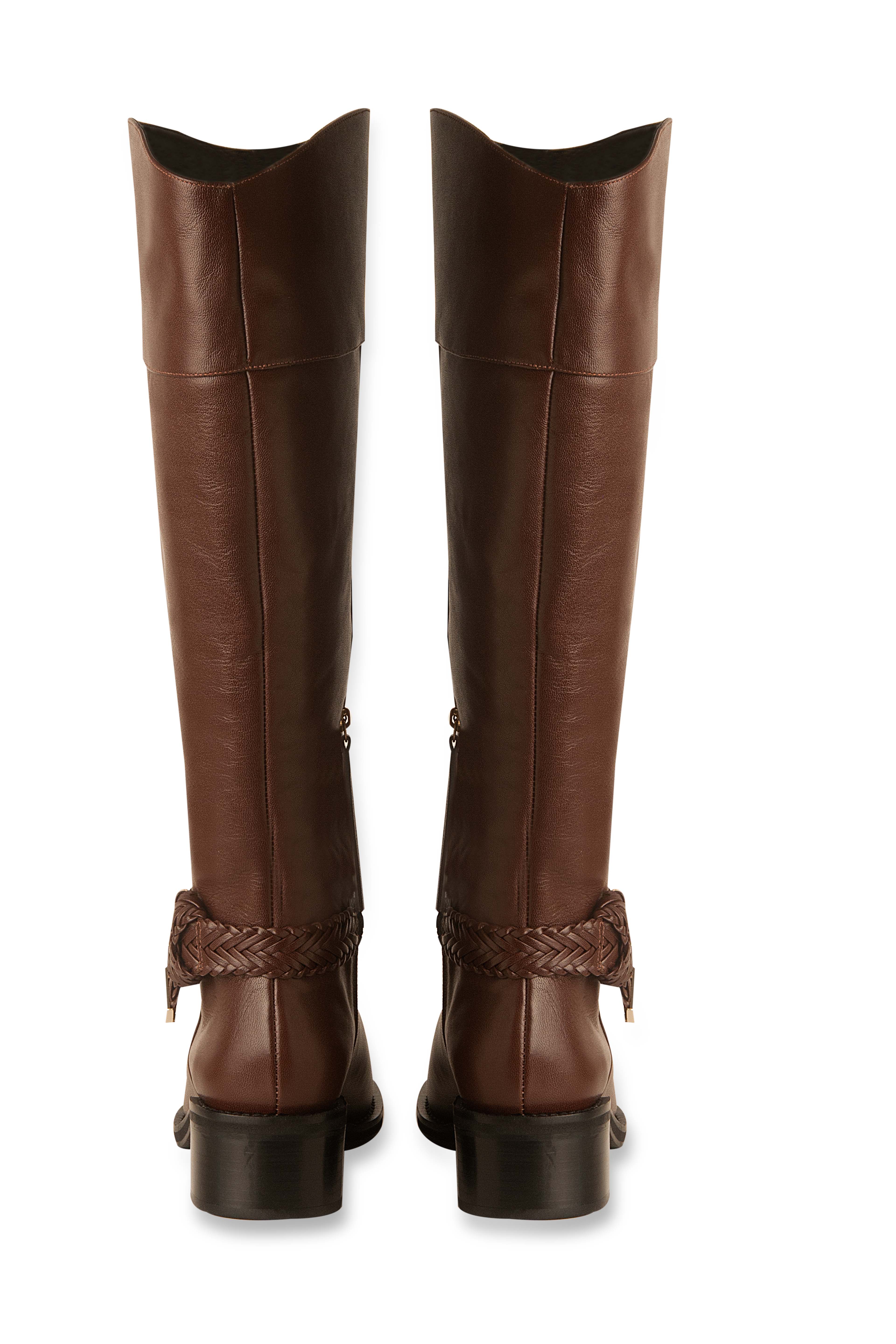 - Bota cano longo confeccionada em couro mestiço, estilo montaria, no tom brown, bico amendoado