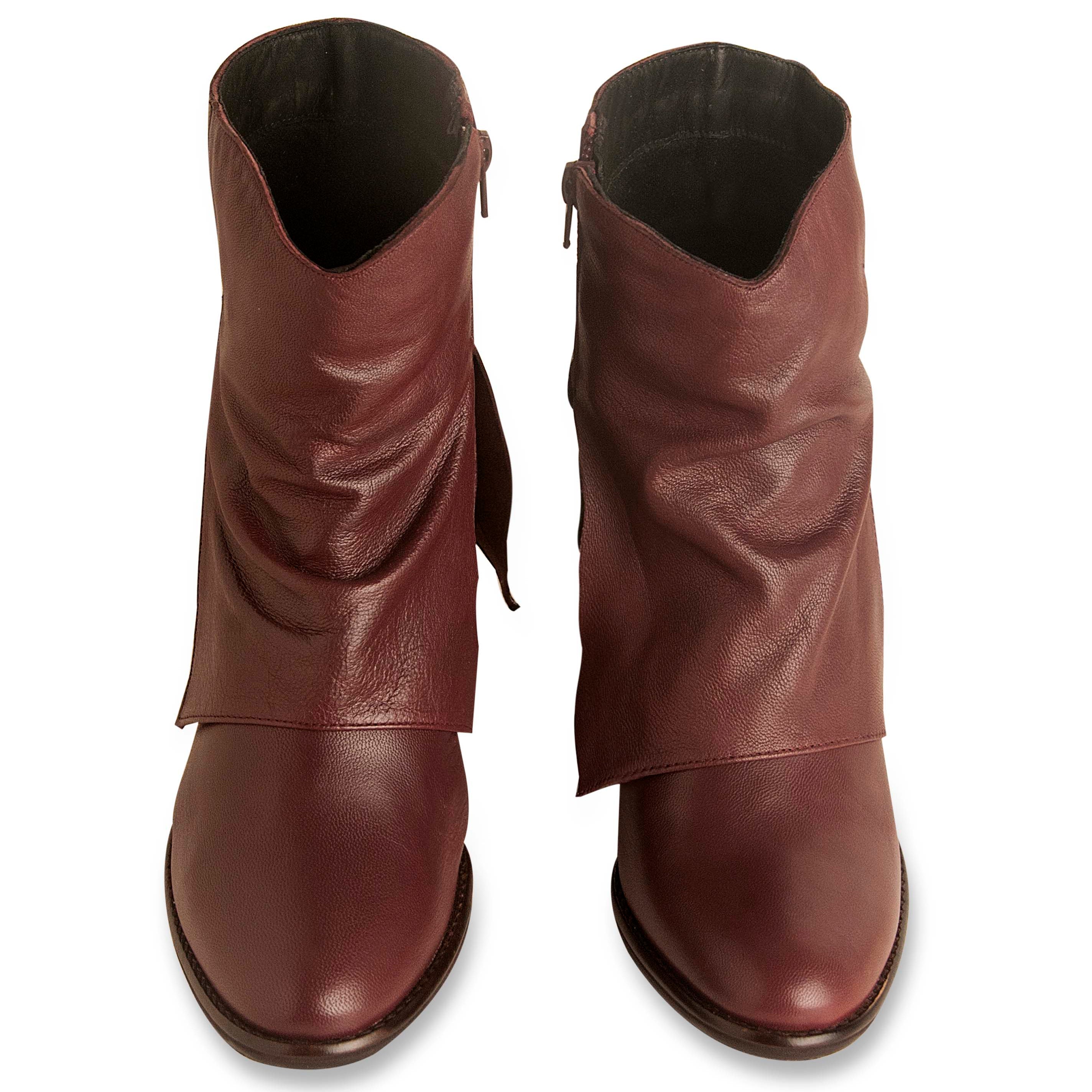 - Bota cano médio, com detalhe de franzido mais estruturado (efeito envelope), confeccionada em couro mestiço no tom burgundy, bico levemente amendoado