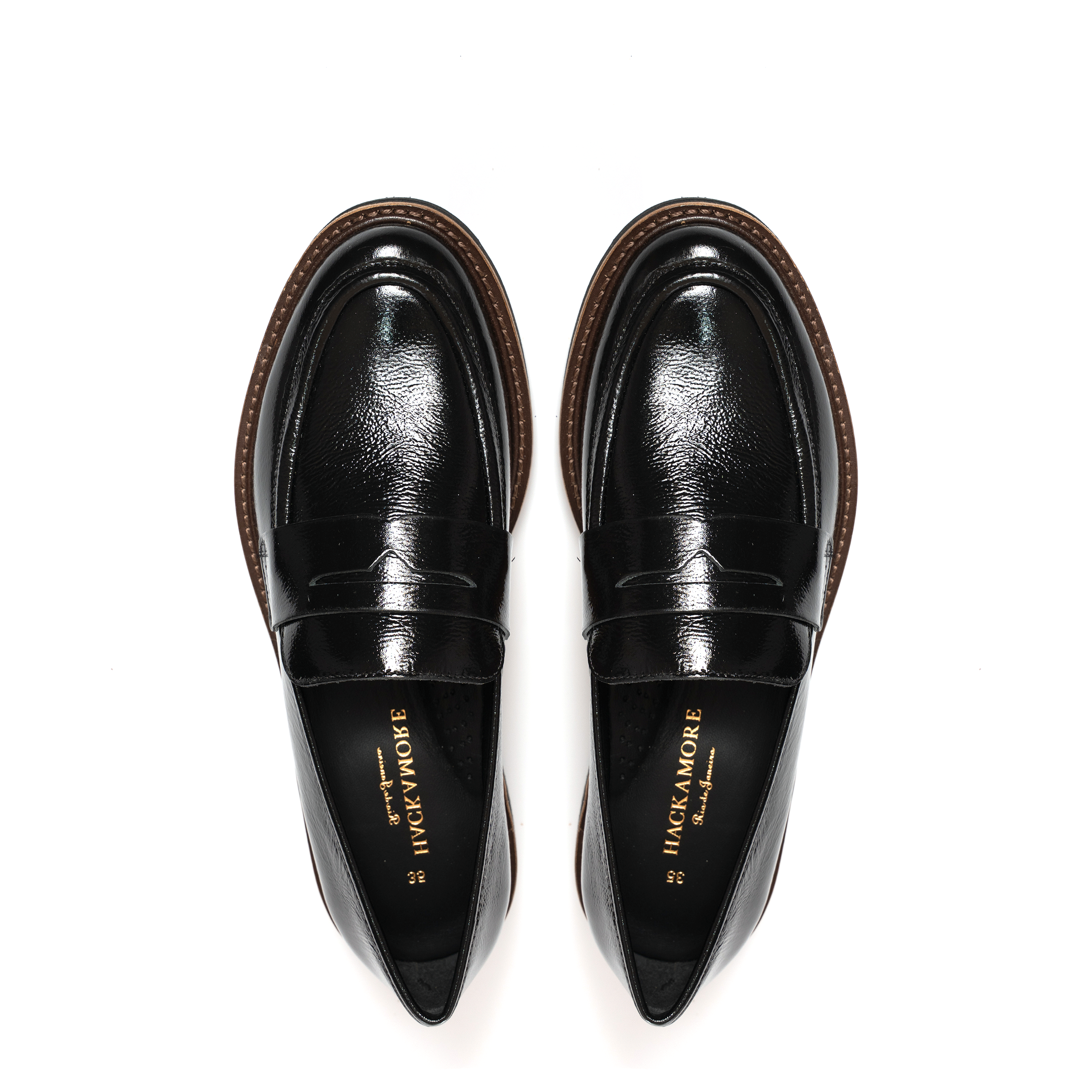 - Gáspea com detalhe de gravata e recorte que caracteriza o modelo loafer