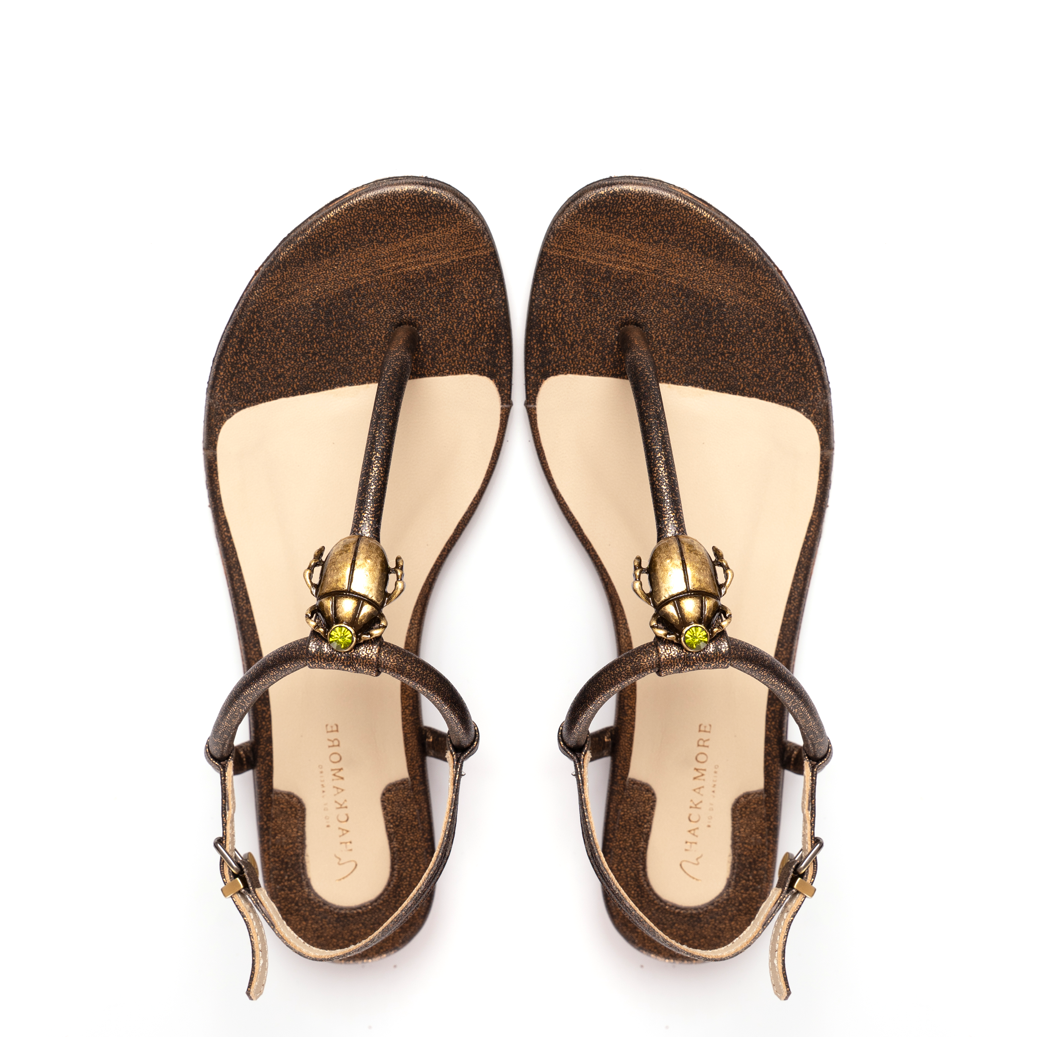 - Cabedal em rolotê de couro no tom dourado com aplicação de enfeite em forma de besouro no tom dourado e detalhe em cristal esmeralda