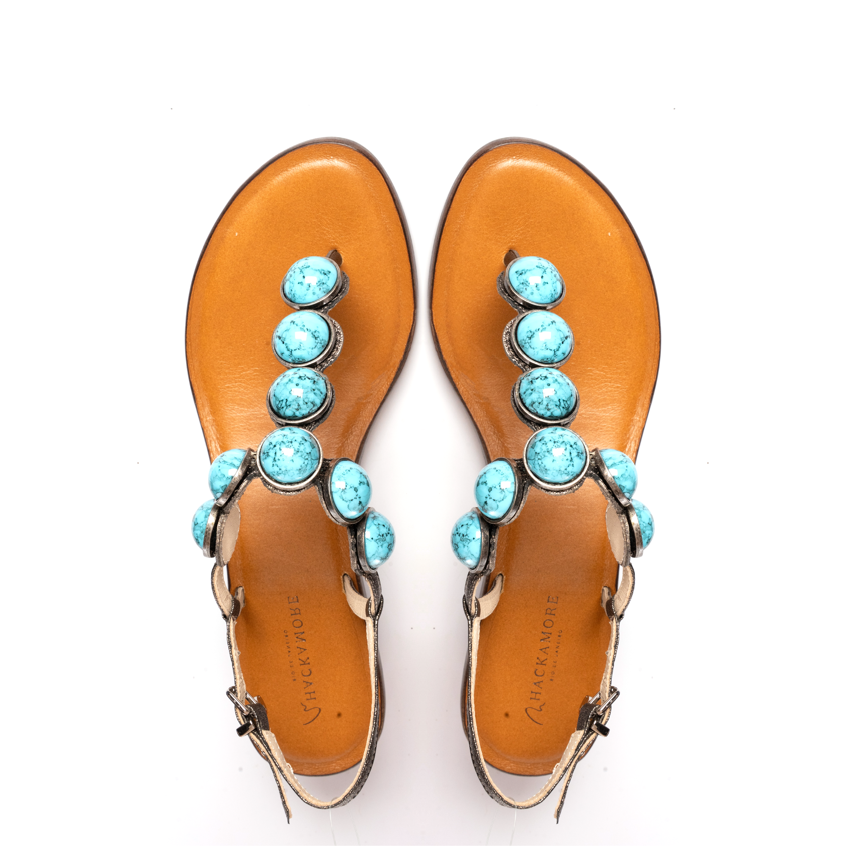 - Detalhe em pedras turquesa arredondadas, aplicadas manualmente sobre o cabedal
