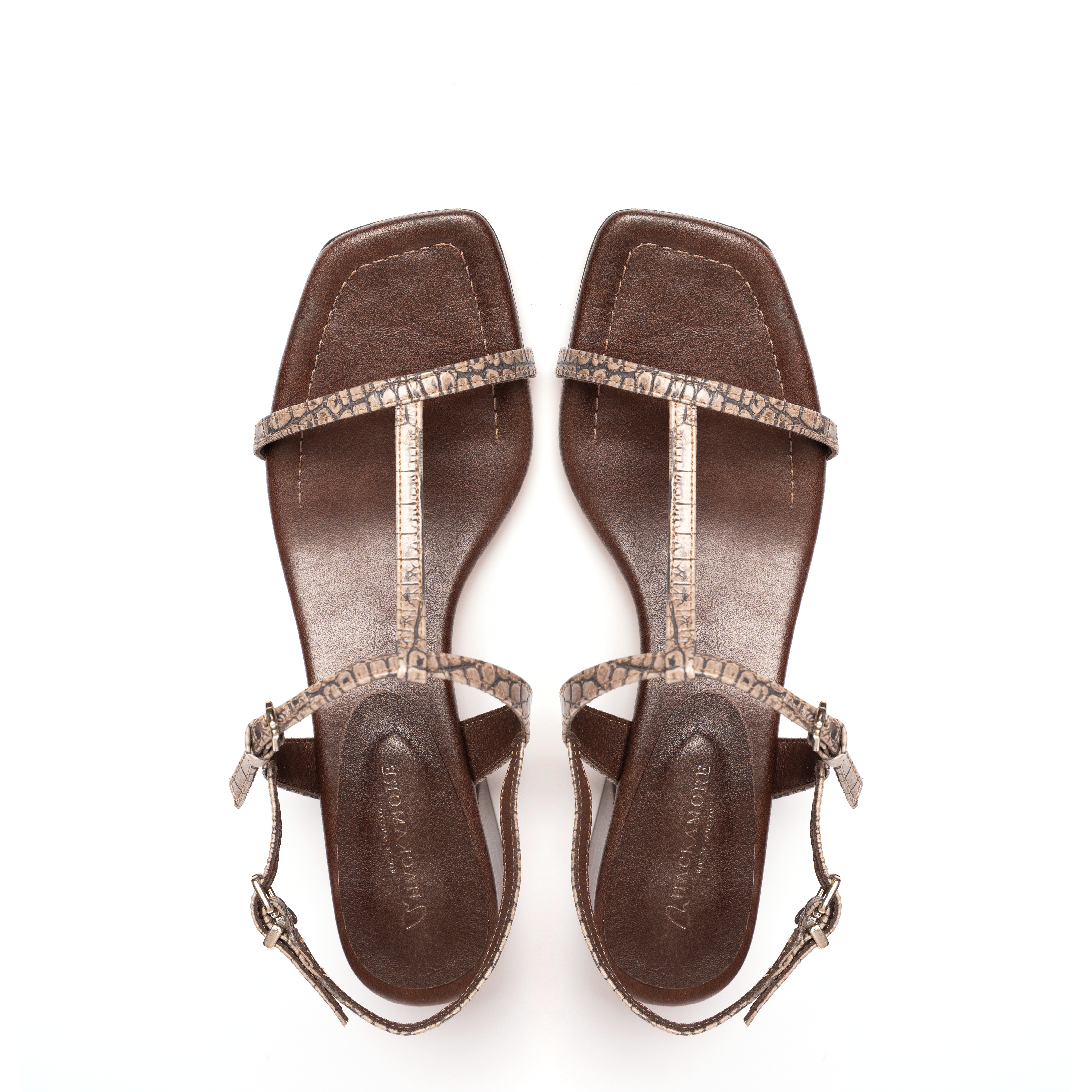 - Sandália média confeccionada em couro estampa croco no tom fendi com bico quadrado