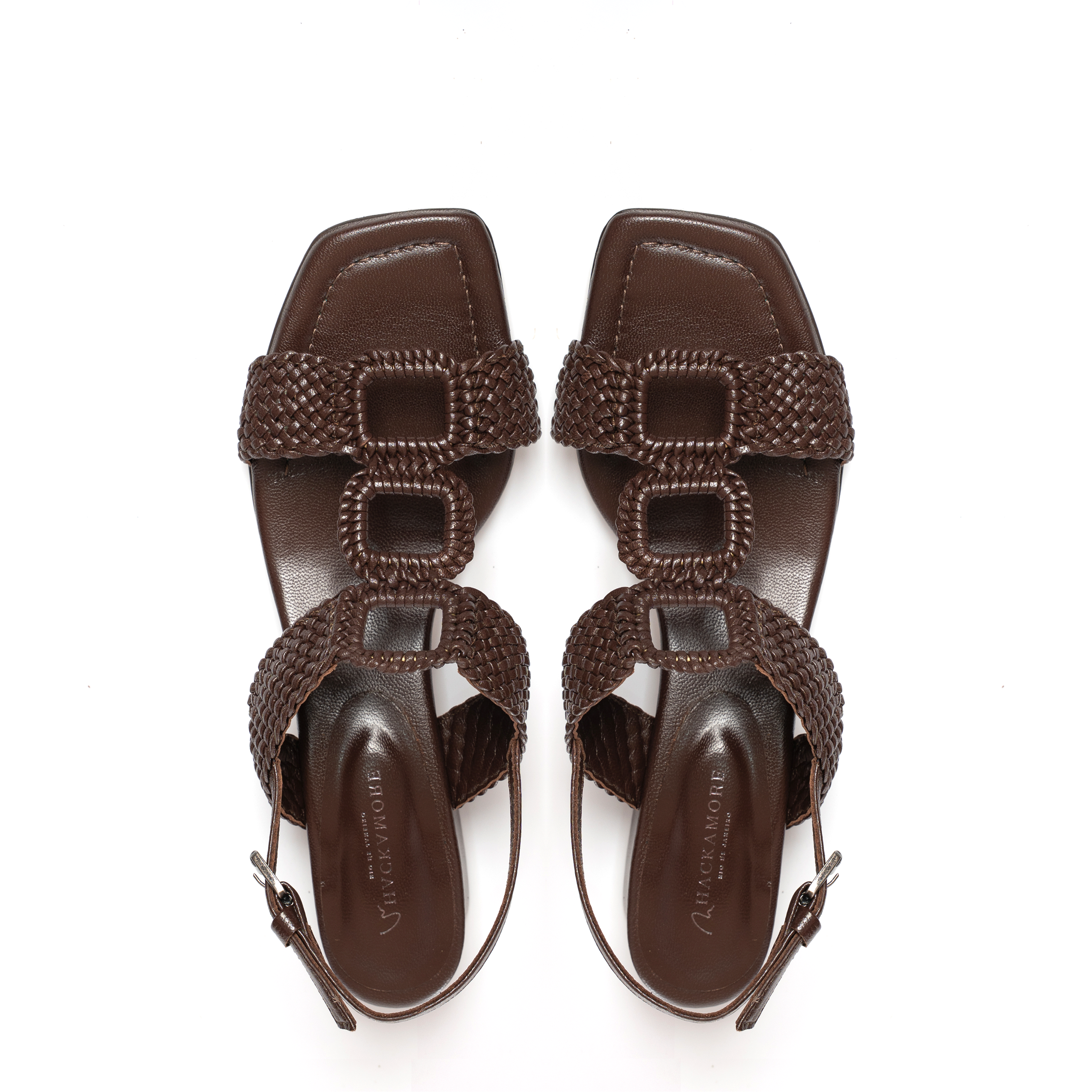 - Sandália confeccionada em couro pelica no tom chocolate, bico quadrado