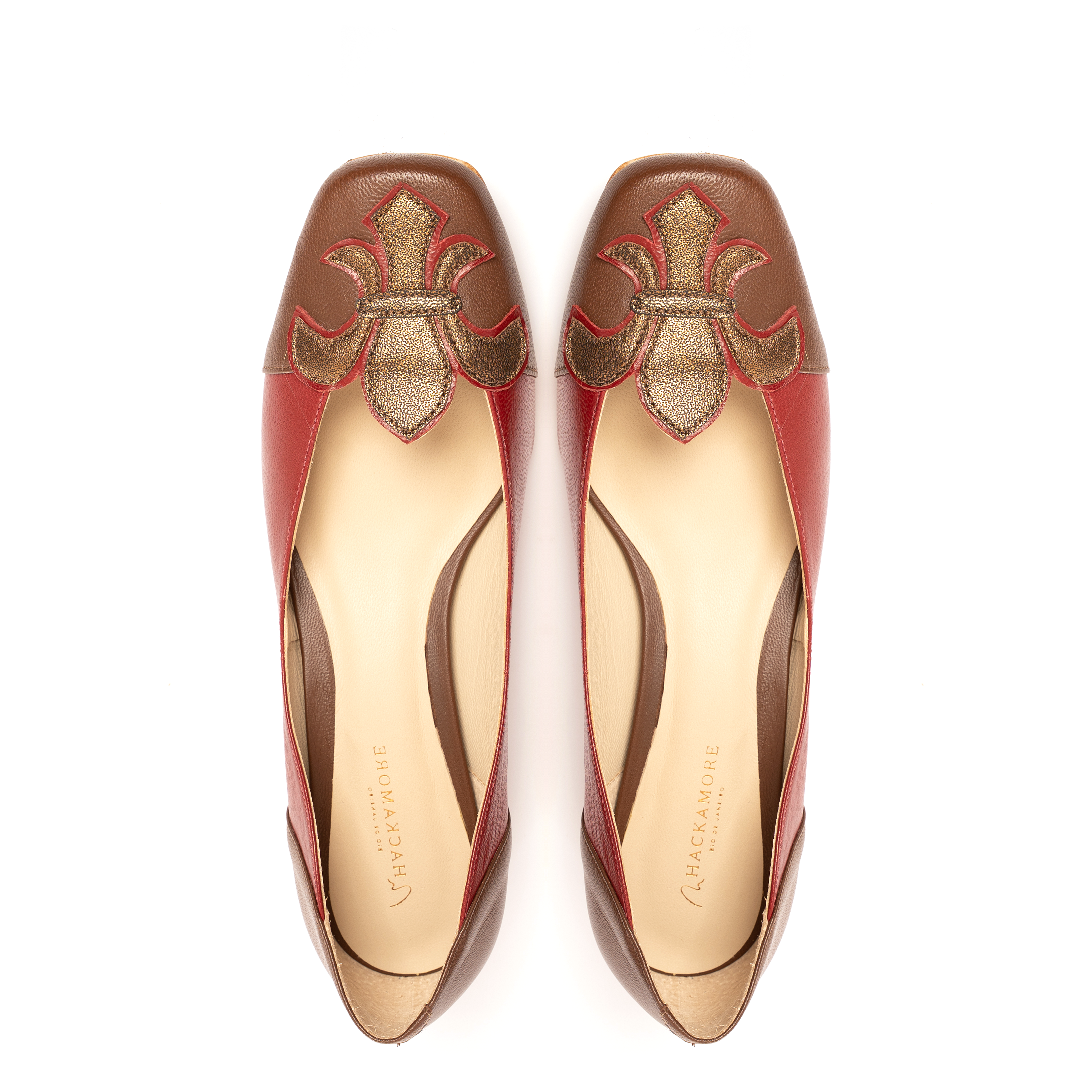 - Detalhede enfeite na forma de flor de liz confeccionada artesanalmente em couro mestiço metalizado no tom dourado, aplicado sobre a biqueira